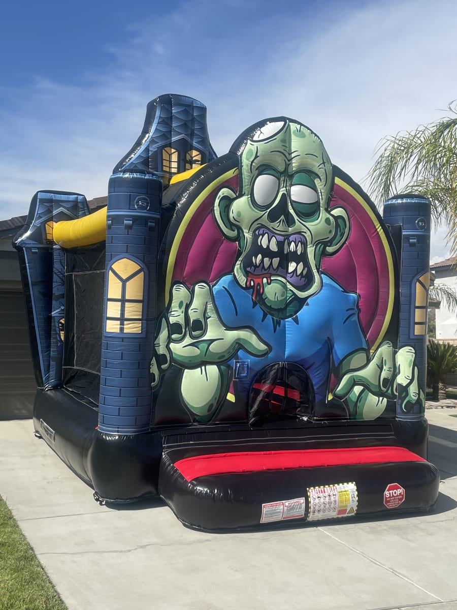 Step into the world of the undead and plan your ultimate Zombie Apocalypse or Walking Dead party now! Our Zombie Themed Inflatable is guaranteed to be the wow factor of your event, providing a thrilling and spine-chilling experience for all who dare to enter. With its meticulously designed zombie-inspired artwork and eerie ambiance, this inflatable masterpiece sets the perfect atmosphere for your Halloween Bash. Immerse yourself in the post-apocalyptic world as you bounce, jump, and navigate through the haunted halls of the Zombie House. With a space requirement of 15'x15', you can transform any area into a frightful playground.